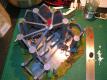 Dazu schneide ich aus 2mm-Pappe unregelmäßige Stücke aus und schräge die Kanten etwas mit dem Bastelmesser ab. In die Mitte dieser Pappunterlage kommt ein ganz flacher Wall aus Styropor. In diesen werden dann die Teile reingesteckt oder drauf geklebt. Zwischen den Schrott kommt schlussendlich Eisenbahn-Schotterstreu.