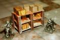 Mit Nietenbändern habe ich ein paar senkrechte Streben gebaut und dann drei Regalböden eingezogen. Schließlich ein paar Holzkisten und Versandkartons gebaut und 'eingelagert'.
