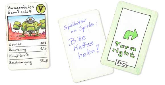 Es gibt 11 Fantasy- und SF-Motive und auch völlig weiße Karten, die auf beiden Seiten gestaltet werden können.