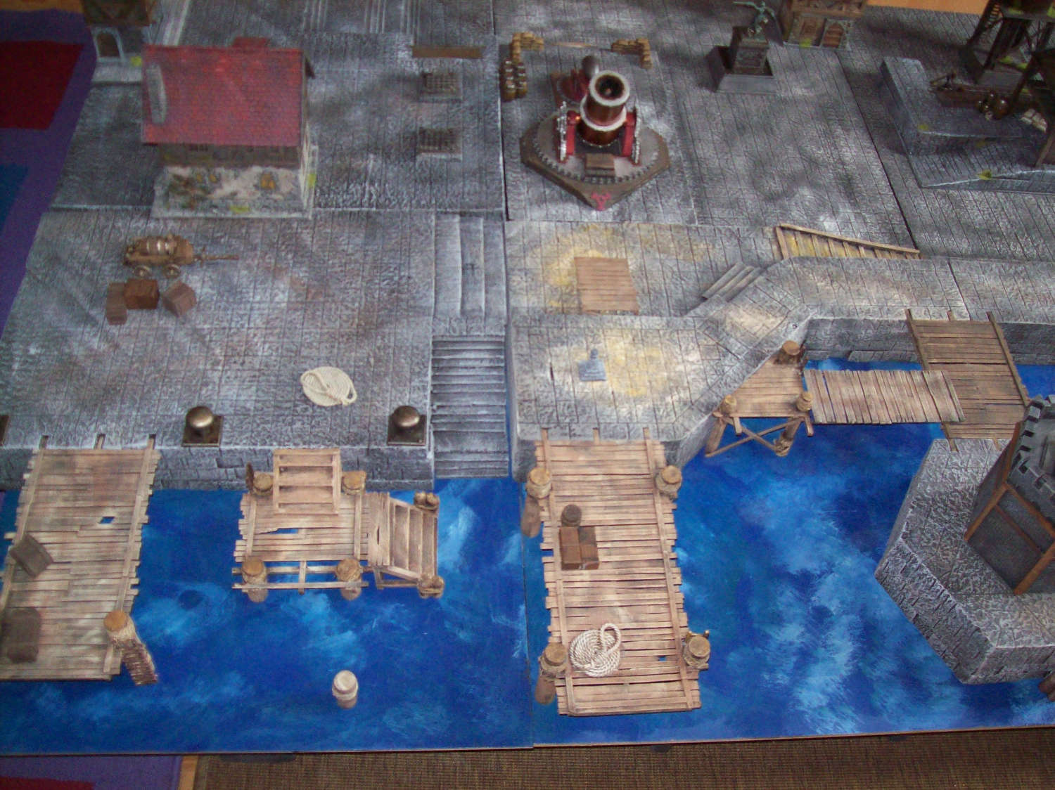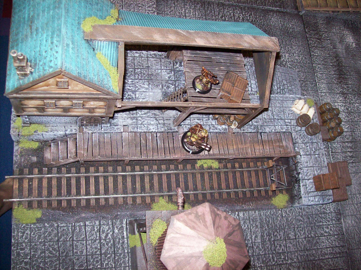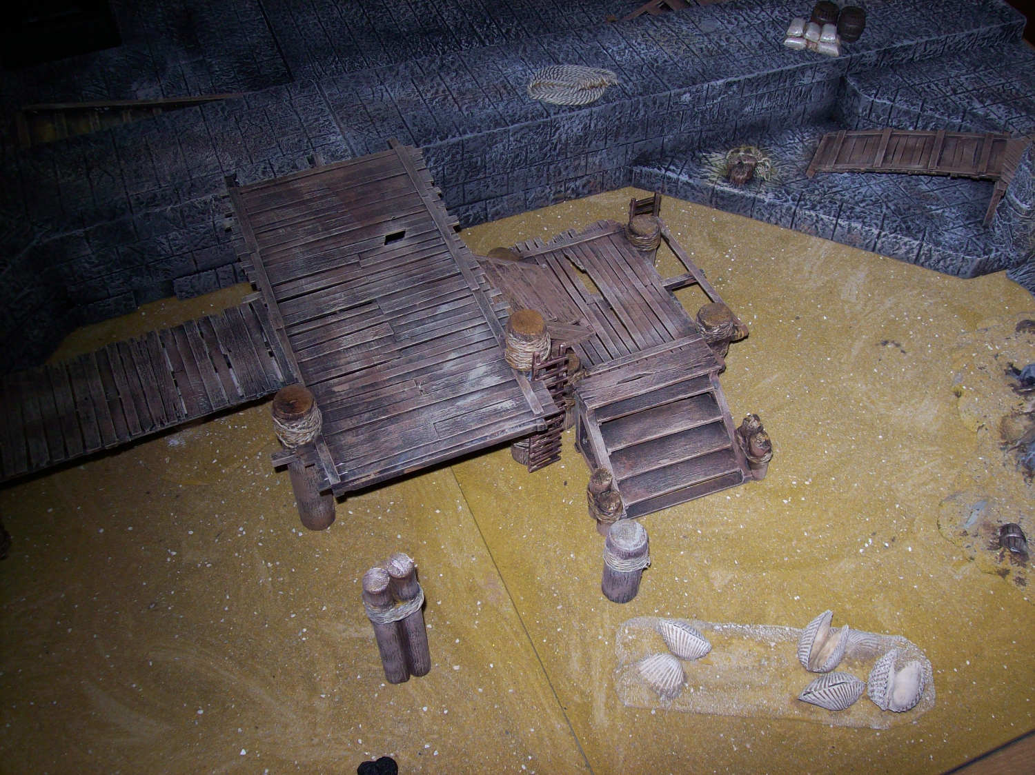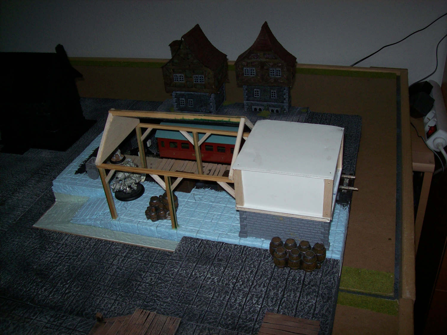 RE: Noisys Gelände - Noisy - 22.03.2013 Hat beides seine Vor- und Nachteile, ich hab auch beiderlei Gebäude zu hause ... wenn man sie selber baut ist es halt mehr Aufwand: speziell bei den Wüstenhäusern hätte ich mir auch mehr Gedanken machen müssen, wie man das Dach abnehmbar macht. Dazu hat ich einfach keine Lust, mal abgesehen davon spiel ich meistens Warmachine und da geht man nicht in Häuser (hab ich zumindest noch nie erlebt), wenn dann schießt man sie erst in Trümmer und spaziert dann durch die Ruine ![]() Allerdings muss ich sagen bietet sich kork als sehr guter Werkstoff für begehbare Häuser und Ruinen an. RE: Noisys Gelände - Noisy - 22.03.2013 So weiter geht's... (Markus wird bestimmt irgendwann noch fluchen dass er mir gezeigt hat, wie man hier Bilder hochlädt )Zur Abwechslung mal was fertig bemaltes: Mein schon mal erwähnter Hafen in einer frühen Phase, mittlerweile ist er fast doppelt so groß. Die einzelnen Plattensegmente sind untereinander austauschbar, man kann zwischen Ebbe und Flut wählen und die Geländestücke sind modular. Schuld an dem ganzen Projekt war übrigens das Schiffsfrack von Ziterdes... das ich mir mal gekauft habe (als Sonderangebot) und dann nicht so recht wußte was ich damit anstellen soll. RE: Noisys Gelände - Noisy - 22.03.2013 .. und hier mal das ganze bei Ebbe: RE: Noisys Gelände - Noisy - 22.03.2013 WIP-Bilder der Lagerhalle RE: Noisys Gelände - Noisy - 22.03.2013 und so sieht das ganze fertig aus: RE: Noisys Gelände - Ben Turbo - 22.03.2013 Schicke Sachen dabei! Wo liegen deiner Meinung nach die Vorteile von Kork beim Häuserbau? Ich hab noch nie mit Kork gearbeitet (ausser bei der Arbeit...). RE: Noisys Gelände - Noisy - 22.03.2013 Danke ![]() den Vorteil von Kork seh ich in seiner Struktur. Man muss keine mehr hinzufügen oder nachmodellieren. gerade bei modernen Gebäuden oder bei Ruinen ist das sehr praktisch. wenn man Kork abbricht hat man eine schöne unregelmässige Kante, mit Styrodur oder Architektenpappe muss man sowas erst aufwendig hinschnitzen. Kork gibt es in entsprechender Stärke, er ist relativ flexibel, sprich man braucht nicht so supergenau arbeiten. Man hat auch ziemlich schnell Ergebnisse