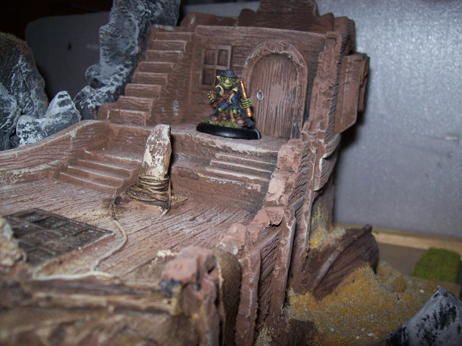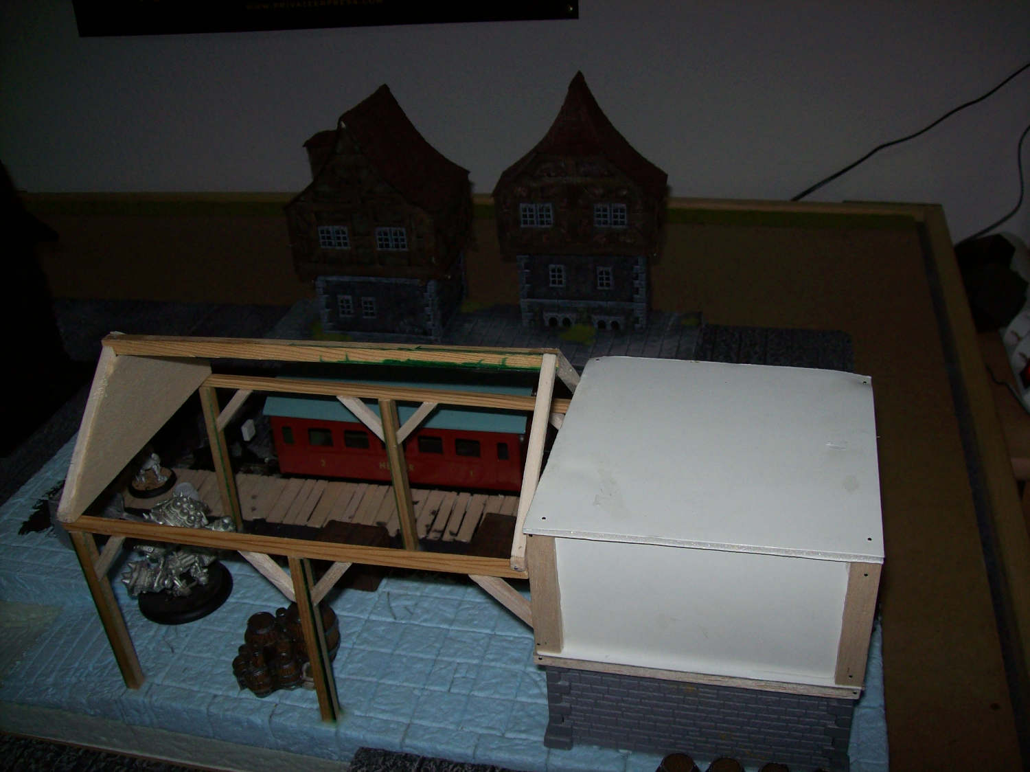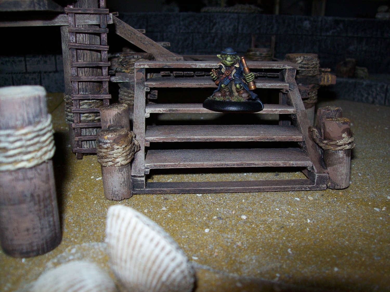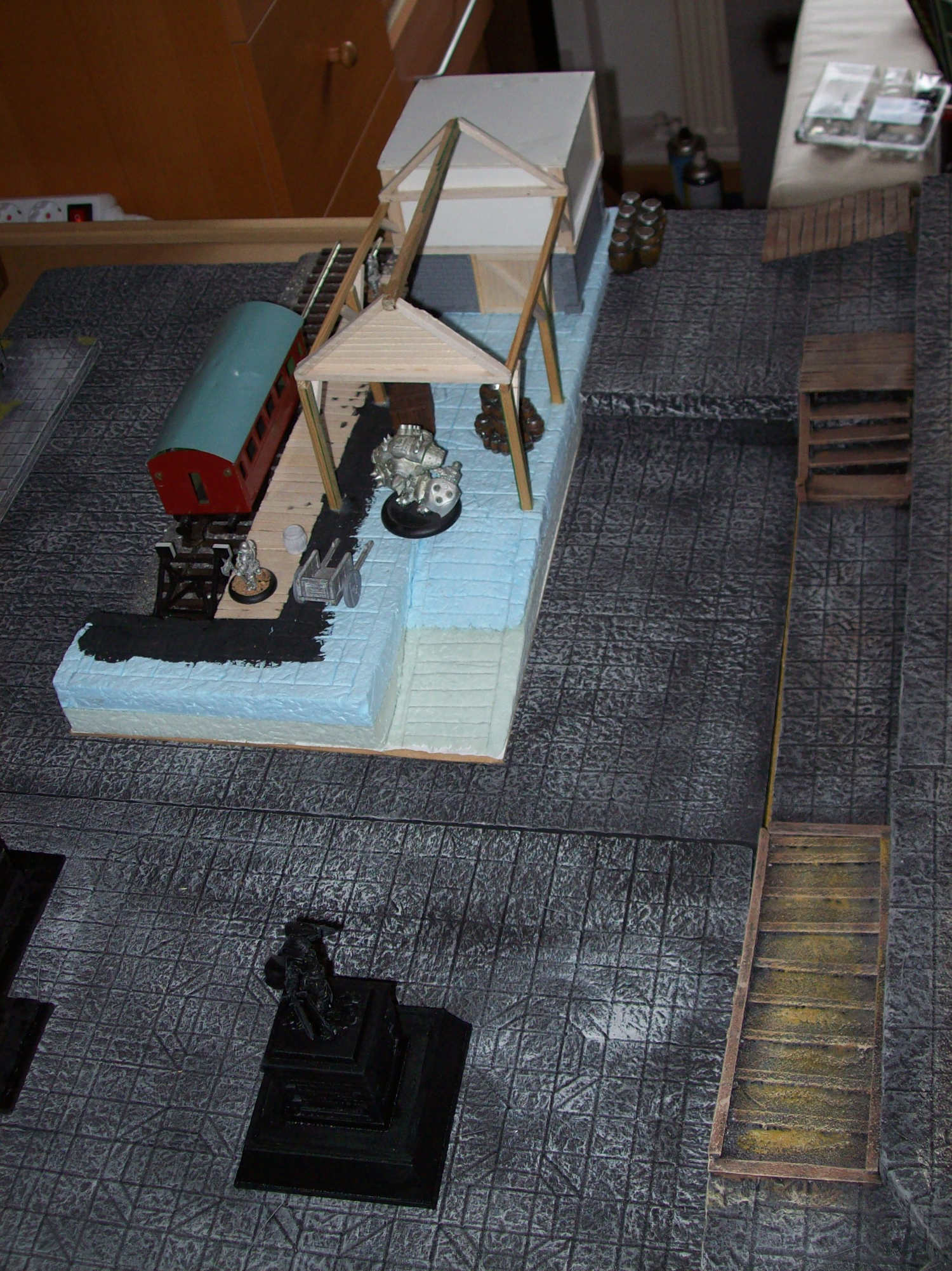 RE: Noisys Gelände - Noisy - 22.03.2013 Hat beides seine Vor- und Nachteile, ich hab auch beiderlei Gebäude zu hause ... wenn man sie selber baut ist es halt mehr Aufwand: speziell bei den Wüstenhäusern hätte ich mir auch mehr Gedanken machen müssen, wie man das Dach abnehmbar macht. Dazu hat ich einfach keine Lust, mal abgesehen davon spiel ich meistens Warmachine und da geht man nicht in Häuser (hab ich zumindest noch nie erlebt), wenn dann schießt man sie erst in Trümmer und spaziert dann durch die Ruine ![]() Allerdings muss ich sagen bietet sich kork als sehr guter Werkstoff für begehbare Häuser und Ruinen an. RE: Noisys Gelände - Noisy - 22.03.2013 So weiter geht's... (Markus wird bestimmt irgendwann noch fluchen dass er mir gezeigt hat, wie man hier Bilder hochlädt )Zur Abwechslung mal was fertig bemaltes: Mein schon mal erwähnter Hafen in einer frühen Phase, mittlerweile ist er fast doppelt so groß. Die einzelnen Plattensegmente sind untereinander austauschbar, man kann zwischen Ebbe und Flut wählen und die Geländestücke sind modular. Schuld an dem ganzen Projekt war übrigens das Schiffsfrack von Ziterdes... das ich mir mal gekauft habe (als Sonderangebot) und dann nicht so recht wußte was ich damit anstellen soll. RE: Noisys Gelände - Noisy - 22.03.2013 .. und hier mal das ganze bei Ebbe: RE: Noisys Gelände - Noisy - 22.03.2013 WIP-Bilder der Lagerhalle RE: Noisys Gelände - Noisy - 22.03.2013 und so sieht das ganze fertig aus: RE: Noisys Gelände - Ben Turbo - 22.03.2013 Schicke Sachen dabei! Wo liegen deiner Meinung nach die Vorteile von Kork beim Häuserbau? Ich hab noch nie mit Kork gearbeitet (ausser bei der Arbeit...). RE: Noisys Gelände - Noisy - 22.03.2013 Danke ![]() den Vorteil von Kork seh ich in seiner Struktur. Man muss keine mehr hinzufügen oder nachmodellieren. gerade bei modernen Gebäuden oder bei Ruinen ist das sehr praktisch. wenn man Kork abbricht hat man eine schöne unregelmässige Kante, mit Styrodur oder Architektenpappe muss man sowas erst aufwendig hinschnitzen. Kork gibt es in entsprechender Stärke, er ist relativ flexibel, sprich man braucht nicht so supergenau arbeiten. Man hat auch ziemlich schnell Ergebnisse