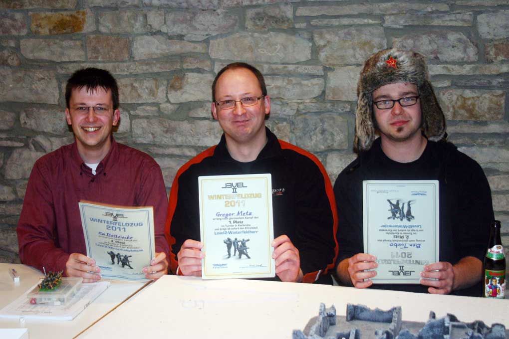 RE: LEVEL2 Winterfeldzug 2011 - Niceyard - 24.01.2011 Eigentlich musst du dazu nur den Text des ersten Errata-Postings in ein Textverarbeitungsprogramm kopieren und es ausdrucken. Die Errata ändern sich ja von Zeit zu Zeit, ich hab keine Lust, ständig neue pdf-files zu generieren. Außerdem hab ich Angst das zu tun, denn nach Murphys Gesetz taucht sofort ein neuer Fehler auf, sobald ein gelayoutetes pdf generiert wurde. RE: LEVEL2 Winterfeldzug 2011 - Niceyard - 30.01.2011 So, endlich gibt es die ersten Bilder zum Winterfeldzug. Diese werden auch ab sofort auf der FlyingGames-CD sein. Die Teilnehmer links oben: Michael Ehrhardt (Veranstalter) Der 3. Platz: Kai Bettzieche Der zweite Platz: Ben Turbo Der erste Platz: Gregor Metz Die drei Sieger |