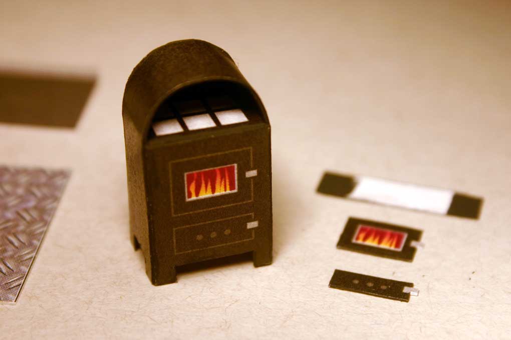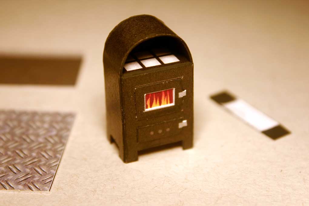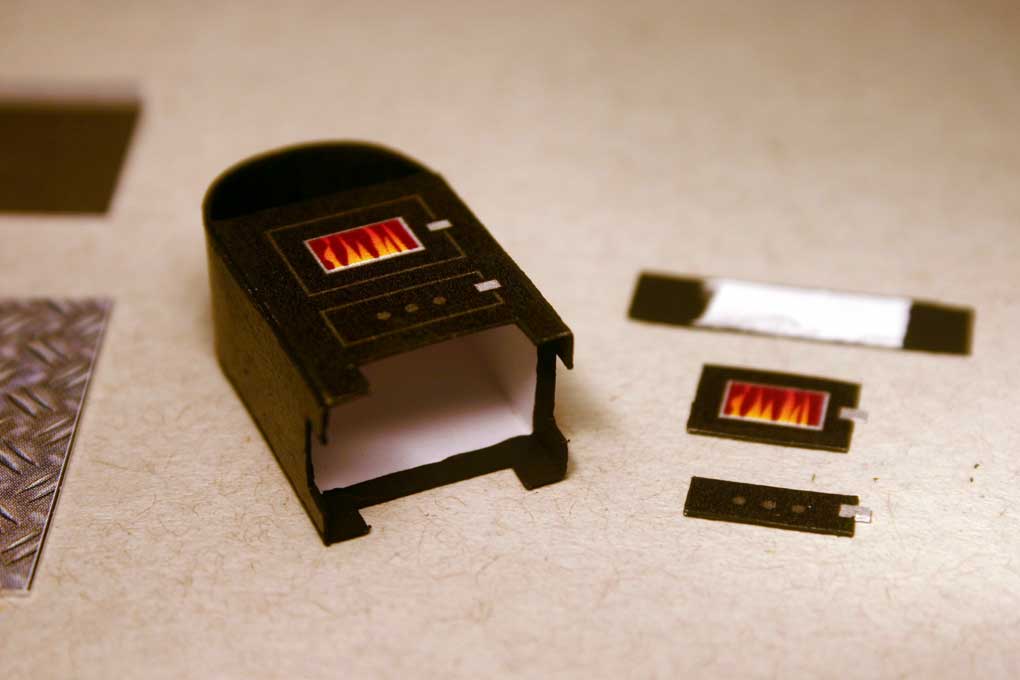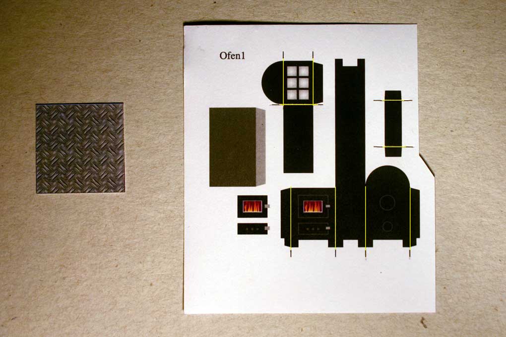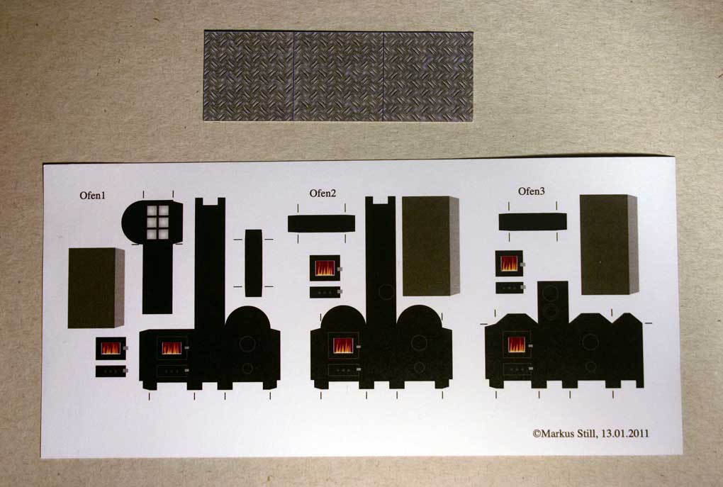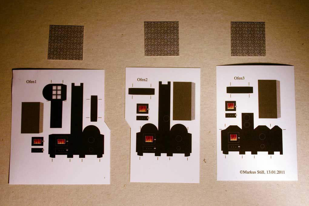 Holzöfen - Bauanleitung / Building Instructions - Niceyard - 19.01.2011 Im FlyingGames-Shop gibt es ab sofort ein kleines Set von drei Holzöfen. Dies ist die Bauanleitung. An dieser Stelle sei angemerkt, die Anleitung vor dem Bau zuerst vollständig zu lesen und beim Bau alles so präzise wie möglich zu befolgen, um ein möglichst fehlerfreies und gutes Ergebnis zu erzielen. Der sorgfältige Bau eines Ofens dauert etwa 60 bis 90 Minuten. Eine Pinzette ist beim Bau von Vorteil. In the FlyingGames shop You can find a small set of wood stoves. This is the building instructions. Please read the instructions completely before You begin to build and follow the instructions as precise as possible in order to get a well built model. The careful build of one stove takes between 60 and 90 minutes. A pincer is of good use during the build. Das ist der Bogen. This is the sheet. Und das sind die fertigen Modelle. And these are the finished models. RE: Holzöfen - Bauanleitung / Building Instructions - Niceyard - 19.01.2011 Zuerst trennt man die drei Ofenmodelle voneinander. Auch die Riffelbleche werden in drei Stücke geschnitten. In dieser Bauanleitung wird nur der Zusammenbau des ersten Ofens beschrieben. Die anderen beiden Öfen funktionieren ähnlich. Sie sind aber einfacher. Seperate the three models. Also cut the underplate in three parts. In this instructions only the build of the first stove is explained. The other two are built the same way. But they are more easy. RE: Holzöfen - Bauanleitung / Building Instructions - Niceyard - 19.01.2011 Die Teile des ersten Ofens werden nun gerillt, wie es die schwarzen Markierungen anzeigen. Die Rillungen sind auf dem Bild als gelbe Linien dargestellt. Take the first stove and groove the parts along the black marks. The grooves are shown in the picture as yellow lines. RE: Holzöfen - Bauanleitung / Building Instructions - Niceyard - 19.01.2011 Alle Teile werden exakt ausgeschnitten. Die beiden Ofentüren sind optional. Cut out all parts exactly. The stove's two doors are optional. RE: Holzöfen - Bauanleitung / Building Instructions - Niceyard - 19.01.2011 Der Ofenkörper und die Ablagefläche werden geknickt und gebogen wie es auf dem Bild ersichtlich ist. The stove's body and the shelf is folded and bended as seen on the picture. RE: Holzöfen - Bauanleitung / Building Instructions - Niceyard - 20.01.2011 Der innere Bogen wird am Ansatzpunkt des äußeren Bogen eingeklebt, sodass die bogenförmige innere Rückwand mit der hinteren Rückwand deckungsgleich ist. Die anderen Öfen haben dieses innere Ablagefach für das Wärmen von Bratäpfeln nicht. Dort entfällt dieser Schritt. The inner arc is glued into the outer arc, where it starts, so that the circular inner board is congruent with the circular backboard. The other stoves don't have that inner part to heat baked apples. The step does not apply there. RE: Holzöfen - Bauanleitung / Building Instructions - Niceyard - 20.01.2011 Die halbkreisförmige innere Rückwand wird an die äußere Rückwand geklebt und gleichzeitig die hintere Wand mit der rückwärtigen Klebelasche zugeklebt. Dabei muss unbedingt darauf geachtet werden, dass die Ablage horizontal ist. Notfalls mit einer Pinzette korrigieren solange der Kleber noch nicht getrocknet ist. Das ist der schwierigste Teil des Modells. The circular inner back is glued to the outer back and at the same time the back of the stove is closed by gluing the back tab. During this proceedure it is important to assure a horizontal position of the shelf. Correct with a pincer while the glue isn't dry yet. This is the most difficult part of the build. RE: Holzöfen - Bauanleitung / Building Instructions - Niceyard - 20.01.2011 Die Vorderseite des Ofenkörpers wird mithilfe der beiden Klebelaschen geschlossen. The front of the stove's body is closed by glueing the two front tabs. RE: Holzöfen - Bauanleitung / Building Instructions - Niceyard - 20.01.2011 Jetzt ist es Zeit, um den Pinsel zu schwingen. Als Farbe eignet sich matte schwarze Dispersionsfarbe, wie sie zum Beispiel zum Wändestreichen verwendet wird (oder mattschwarze Acrylfarbe). Ein Pinsel der Größe 0 eignet sich gut. Die Kanten des zusammengebauten Ofens sollten geschwärzt werden, sowie die Kanten der noch nicht verbauten schwarzen Teile. Auch die untere Innenseite des Ofens sollte geschwärzt werden, damit man bei flachem Blickwinkel nicht die weiße Innenseite der Standfüße sieht. Auch die Rückseite des schwarzen Streifens (zumindest der Klebelaschen) sollten schwarz bemalt werden. Now it's time to paint. You can use some flat black dispersion paint used for painting walls (or mat black acrylic colour). A size 0 brush is good. The edges of the stove's body as well as the edges of the untouched parts are to be blackened. The lower inside of the stove's body should be painted, too, in order to avoid white looks of the inside of the stove's legs. The backside of the black stripe (or it's glue tabs) should be painted black, too. RE: Holzöfen - Bauanleitung / Building Instructions - Niceyard - 20.01.2011 Die Ofentüren werden angeklebt um der Vorderseite etwas Profil zu geben. Dieser Schritt ist optional. Das Sichtfenster der oberen Tür kann ebenfalls ausgeschnitten werden. Attach the stove doors to get rid of the flat look of the front. This step s optional. If You want to, You can cut out the fire window of the upper door. |