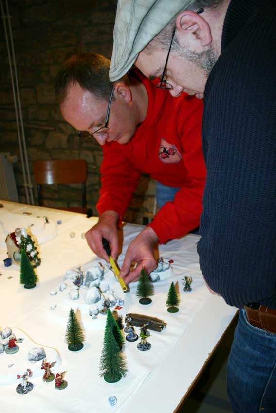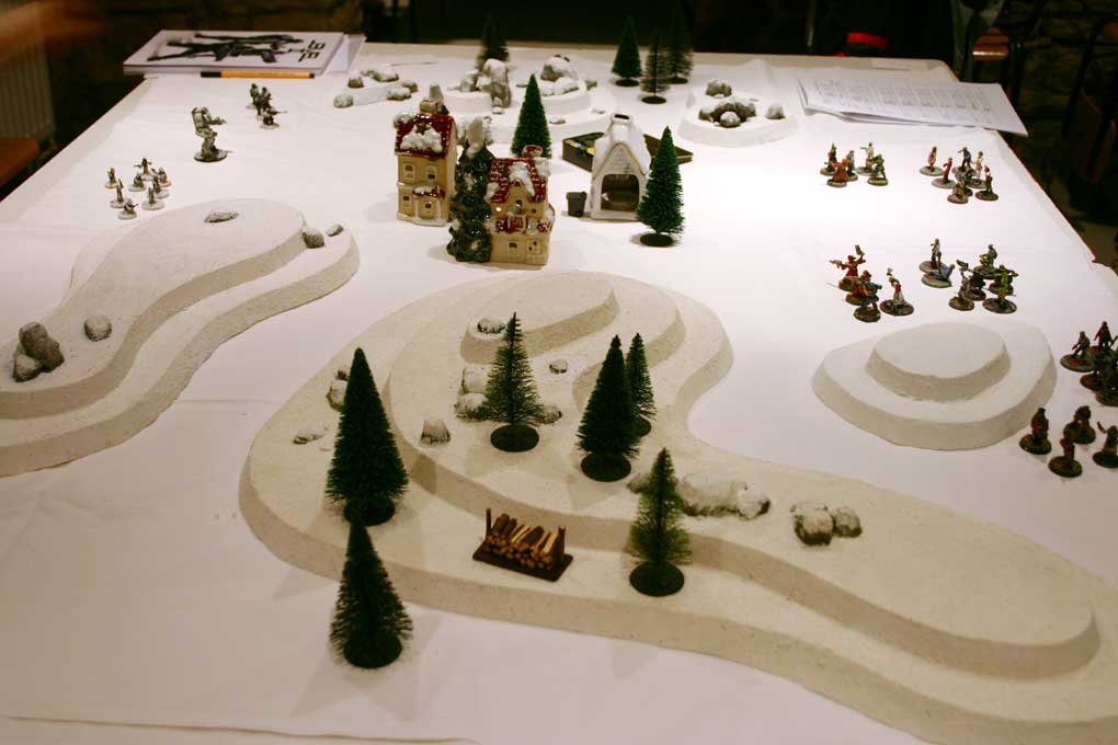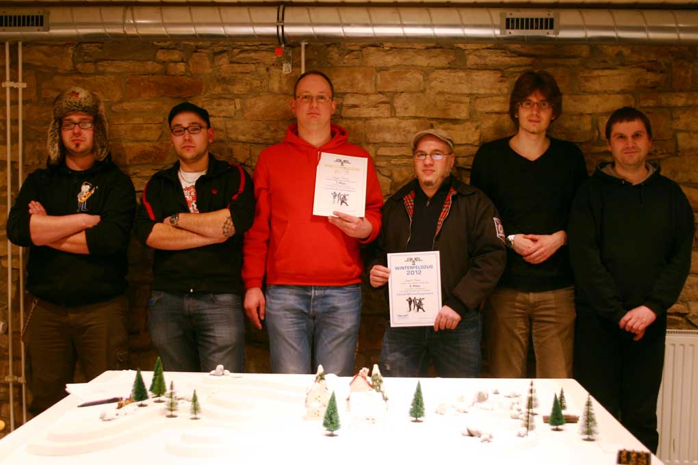 Winterfeldzug 2012 Rückschau - Niceyard - 08.02.2012 Hallo LEVEL2-Spieler und Winterkrieger! Am vergangenen Sonntag (05.02.2012) fand zum zweiten mal der Winterfeldzug statt. Dieses Thema ist die Rückschau und detaillierte Berichterstattung der Ereignisse und mehr oder weniger der zweite Teil vom Thema über die Turnierbedingungen und die Anmeldung. Es gab 7 Teilnehmer, die hier fast alle nochmal auf dem Gruppenbild nach der Siegerehrung zu sehen sind. vlnr: Ben, David, Gregor, Daniel, Philip und Ronny. Thorsten ist nicht auf dem Bild, weil er früher weg musste. Die Gewinner des diesjährigen Turniers sind: 1. Gregor Metz - Winterfeldherr 2012 u. 2011 2. Thorsten Sattler - Wintermajor 2012 und Weltmeister 1999, 2000 u. 2003 3. Daniel Merk - Winterhauptmann 2012 und Weltmeister 2010 Herzlichen Glückwunsch an die Sieger und vielen Dank an alle Teilnehmer! Dieses mal hatte Michael leider keine Zeit zum organisieren (Vielen Dank nochmal an Michael für letztes Jahr), deshalb habe ich es dieses Jahr selbst gemacht. Dieses Jahr haben wir beim Winterfeldzug auch die Turnierdurchführung von der letzten WM 2011 übernommen. Also kein KO-System mehr, damit alle mehr zum Spielen kommen und etwas der Glücksfaktor rausgenommen wird, und ein schlechtes Spiel nicht gleich zum Ausscheiden führt. Das war gut und fand bei allen guten Anklang. Das Turnier schien für alle Teilnehmer eine angenehme und schöne Veranstaltung gewesen zu sein. Ich habe schon im Vorfeld lauter gute Punktelisten bekommen, die ich jede einzelne am liebsten selbst gern ausprobiert hätte, und der Feldzug selbst war gekennzeichnet von ziemlich hohem Spielstandard. Die Teilnehmer haben sich außerordentlich gute, spannende und faire Spiele geliefert, die auf sehr hohem taktischen Niveau abgelaufen sind. Hier die Liste der Spiele mit dem jeweiligen Ergebnis: Runde 1: Tisch 1 - Daniel (10) vs. Gregor (10) Tisch 2 - Philip (1) vs. David (8) Tisch 3 - Thorsten (17!=25,5) vs. Ben (1=1,5) Aussetzer: Ronny Runde 2: Tisch 1 - Thorsten (1) vs. David (4) Tisch 2 - Daniel (7) vs. Ronny (4=6) Tisch 3 - Gregor (18!) vs. Philip (0) Aussetzer: Ben Runde 3: Tisch 1 - Philip (15!) vs. Ronny (0=0) Tisch 2 - Gregor (9) vs. Ben (5=7,5) Tisch 3 - Daniel (6) vs. David (4) Aussetzer: Thorsten Die Punkte derer, die nur 2 Spiele zu machen hatten wurden 1,5-fach gewichtet. Das Endergebnis nach PUnkten war demnach folgendes: Gregor Metz - 37 Thorsten Sattler - 27 Daniel Merk - 23 David Turbo - 16 Philip Caroli - 16 Ben Turbo - 9 Ronny Wolf - 6 Der zeitliche Ablauf war dieses Jahr etwas nach hinten gedehnt, weil ich sehr schnell gemerkt habe, dass etwas mehr Ruhe statt preussische Pünktlichkeit dem Ablauf insgesamt gut tut. RE: Winterfeldzug 2012 Rückschau - Niceyard - 08.02.2012 Weiter geht es mit ein paar Bildern von den 3 Spielflächen. Tisch 1: Hügellandschaft verschneite, steinige Hügel und ein kleines Dorf im Zentrum Tisch 2: Mülldeponie Schrotthäufen und Felsen, dazwischen verlassene Wellblechhütten Tisch 3: Industriegebiet antike Fabrikruinen, technische Anlagen und die General-Heruth-Stiftungsbrücke Auf jedem Tisch waren in der Mitte und rechts und links drei Zielobjekte (Holzöfen, Holzstapel, Frachtkisten), die es um der Siegpunkte Willen zu erreichen galt. Ich habe versucht, vorher noch soviel wie möglich winterliche Hügel zu bauen, was auch ganz gut geklappt hat. Der letzte Hügel wurde sogar gerade noch 15 Minuten vor Abfahrt fertig. Mehr will man natürlich immer, aber ich denke die Tische waren recht gut bestückt. Das Feedback der Teilnehmer zum Gelände war jedenfalls sehr gut und das nehme ich als Ansporn für's nächste Jahr. So wird das Winterturnier immer verschneiter und cooler. An dieser Stelle auch nochmal vielen Dank an Gregor und Ronny, die mit ihrem Gelände auch zur Qualität der Tische beigetragen haben. RE: Winterfeldzug 2012 Rückschau - Niceyard - 08.02.2012 Besonderes Augenmerk möchte ich auch noch auf ein Geländestück lenken, das von Macaloni gestiftet wurde, um das Winterturnier noch schöner zu machen: Es handelt sich um die General-Heruth-Stiftungsbrücke Macaloni hat diesen umfangreichen Warzone-Kartonbausatz vor einigen Jahren nicht nur gebaut, sondern außerordentlich gut gebaut. Die Kanten sind alle gefärbt und der Bau sehr präzise, es wurde auch noch der Brückenkopfbunker mit Innenraum und abnehmbarem Dach versehen. Die Tür und die Fensterluke lassen sich öffnen. Ein richtig tolles Ding! Hier ein paar Fotos von diesem traumhaften Stück, das auf dem Winterfeldzug die Geschehnisse um das Industriegelände dominierte. Ich bitte zu entschuldigen, dass die Fotos nicht so ganz optimal sind. Die Beleuchtung war eher etwas düster und die Umstände des Fotografierens meistens gehetzt, weil ich ja hauptsächlich das Turnier leiten und den Leuten bei Regelfragen zu Seite stehen musste. Aber ich denke, man kann den Bildern ganz gut entnehmen wie es aussah. RE: Winterfeldzug 2012 Rückschau - Niceyard - 08.02.2012 Zu guter letzt möchte ich auch noch etwas zur Location loswerden. Zum zweiten mal durften wir ja den Winterfeldzug im Gewölbekeller des Thoule Rollen- und Brettspielvereins abhalten. Die Räumlichkeiten sind nach meinem Dafürhalten optimal. Der Keller ist stimmungsvoll und die Möblierung sehr gut. Hier noch zwei Bilder von der Action. Außerdem gab es an dem Tag noch Schnitzel mit Pommes und Sauce für uns - und das auch noch zu einem sehr fairen Preis von nur 3,50. Vielen Dank an Küchenchef Jürgen. Der einzige Wermutstropfen an diesem Tag war die 20-minütige Wartezeit bei -10 Grad vor der Tür, weil sich Jürgen verspätete. Wir haben die Zeit allerdings genutzt, um alle Filmzitate und Bundeswehrgeschichten rund um das Thema Schnee, Eis und Erfrieren auszupacken. Eigentlich ein perfekter Anfang für's Winterturnier. ![]() Nächstes Jahr werde ich auf jeden Fall versuchen, das Winterturnier in dieser Form wieder zu organisieren und Details zu verbessern. Ich würde mich jedenfalls freuen
