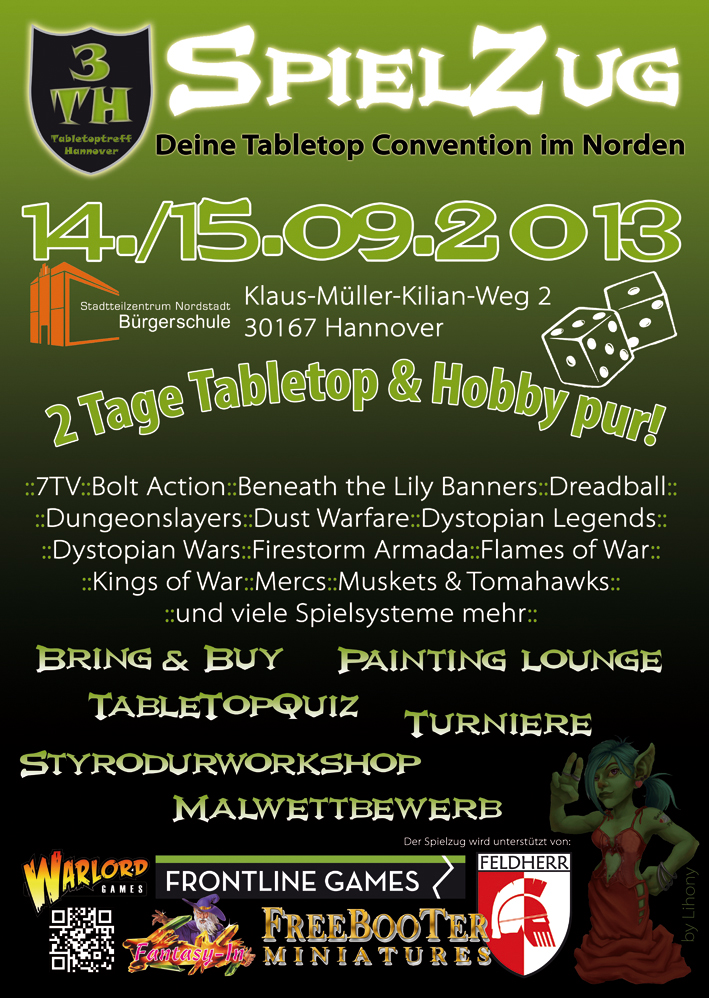 Der 3TH TableTopTreff Hannover e.V. präsentiert deshalb, inzwischen zum vierten Mal, die Tabeltop Convention "Spielzug". Vom 14. bis 15.09.2013 heißt es wieder für alle Liebhaber und Freunde "2 Tage Tabletop und Hobby pur!" im Stadtteilzentrum Nordstadt, Bürgerschule Hannover.