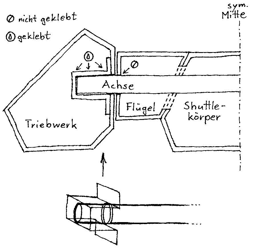 Zuerst habe ich den Korpus normal zusammengeklebt, aber kurz nach dem Baubeginn fasste ich den Entschluss, dass die Triebwerke drehbar sein sollen. Also habe ich eine Achse in das Modell eingebaut, wie man es auf der schematischen Zeichnung sehen kann.