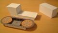 Here you see the first test build of the new transporter: platform with cab, container and one side of the tracks, the latter with graphic detail and colouring. I could take the engine (grey box between the wheels) from the old transporter.