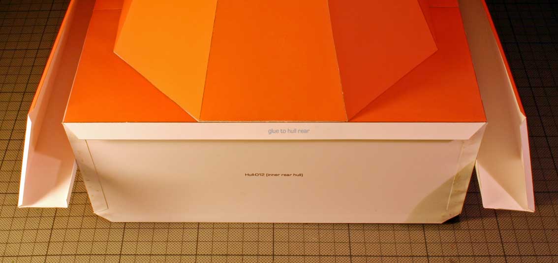 Now the side wings are glued to the hull. It is very important, that the front and rear edges