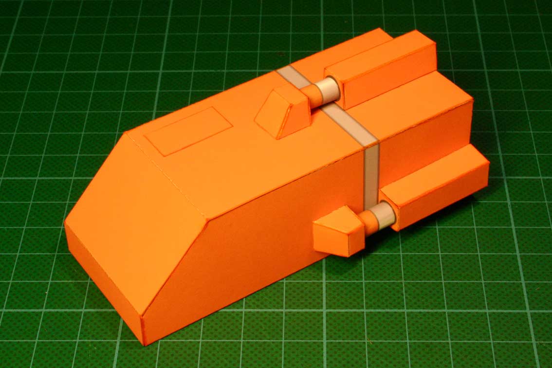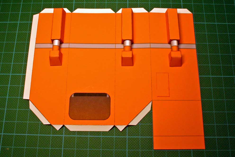 Dann wird das mittlere Heck von oben nach unten auf die beiden Seitenteile geklebt. Man sollte