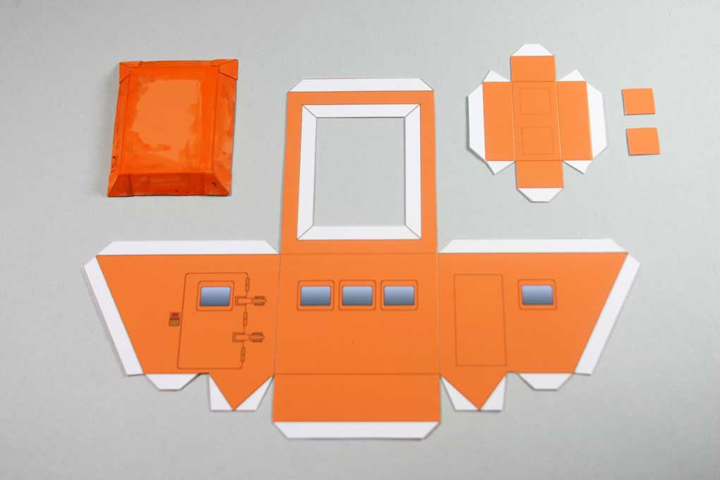 Bemerkenswert beim Zusammenkleben der Teile ist, dass die innere Klebelasche gefaltet wird, die äußere allerdings gerade bleibt.