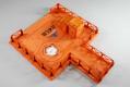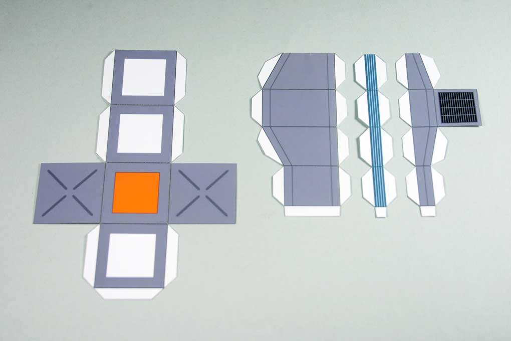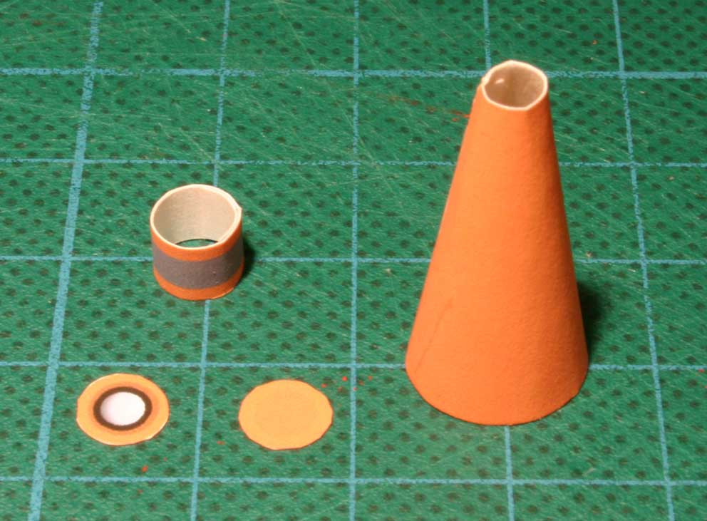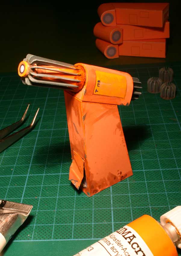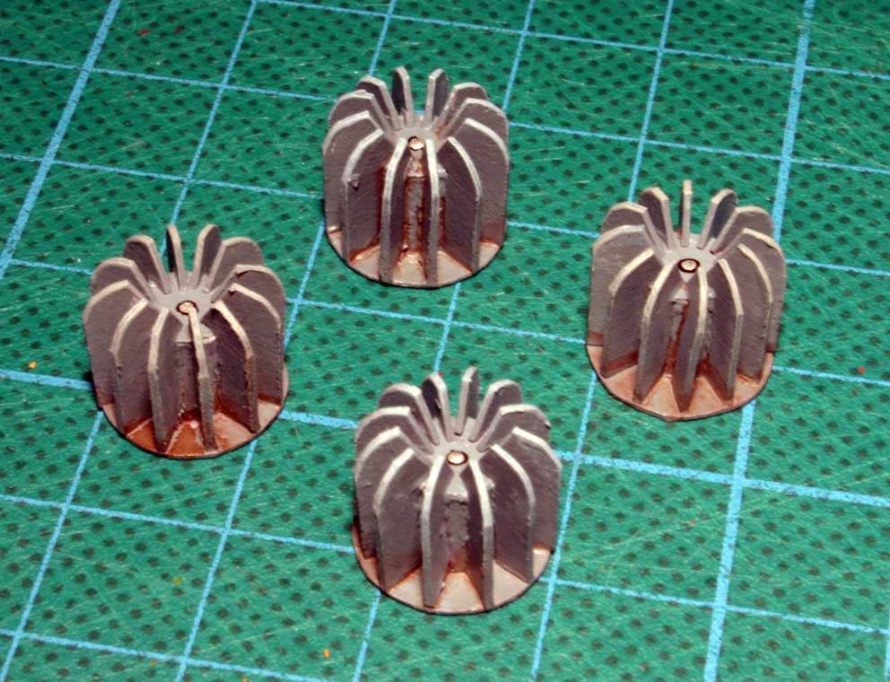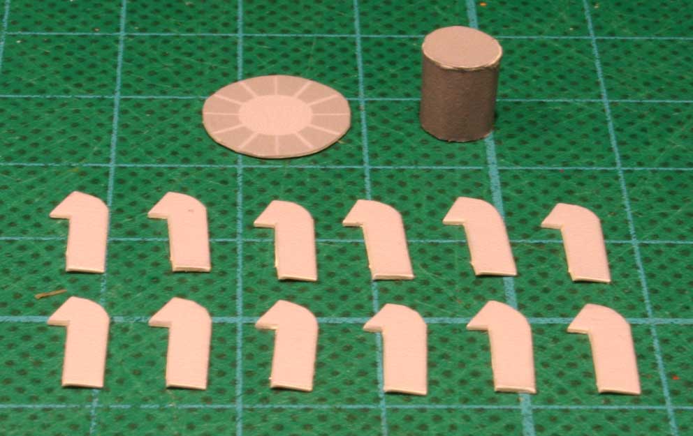 The completed body is glued onto the center of the base plate. The radiators are attached around it as indicated by the light grey lines on the base plate. A pincer is of good use while doing this.