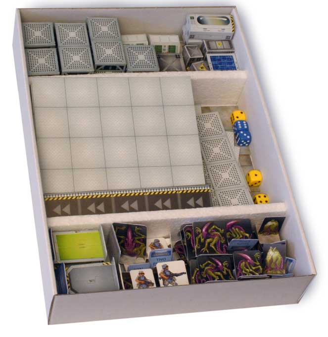 In der Box gibt es eine große Zahl von Bodenplatten unterschiedlicher Art, aus denen man Raumteile und Gänge in gewünschter Größe ausschneiden kann. Am besten sieht das ganze aus, wenn man es auf einem dunklen Tischtuch auslegt oder auf einem schwarzen Karton aufklebt, damit die Freiräume zwischen den Korridoren düster aussehen.