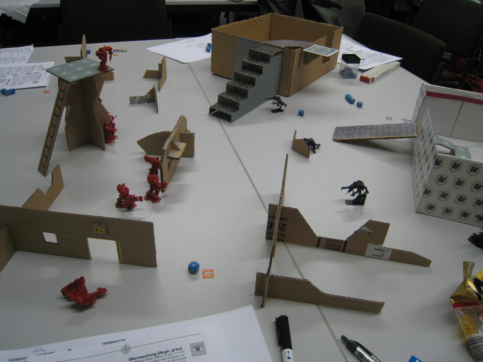 Zitat:Weiterhin wurde der Feuer Befehl als zu mächtig angesehen. Gerade der Terminator mit der Gatling im Dauerfeuer. Allerdings haben wir eingesehen, dass die Aliens ja selbst nicht feuern und es halbwegs offenes Gelände war. Aus dem Grund war es womöglich ein wenig einseitig.