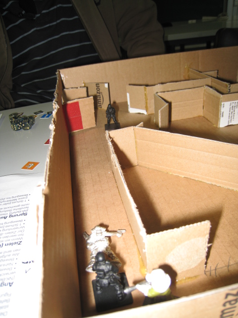 Der Untergruppenführer überwacht den Korridor, während sein Begleiter (schwarze Figur) vorbrescht und zusammengeschossen wird: