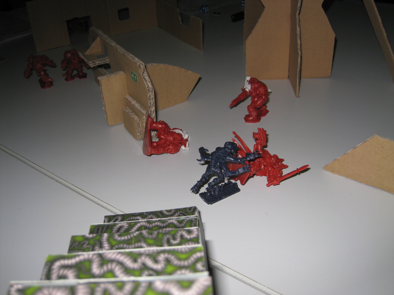 Sicher, sicher. Am Anfang war es noch ein wenig härter. Wenn du dir die ersten Bilder genauer ansiehst, dann war das Geländer einen Tick mehr verwinkelt. Sagen wir zwischen den einzelnen Deckungsmöglichkeiten lagne 15cm bis 20cm. Das konnten die Aliens mit ihren 30cm Bewegungsweite gut ausnutzen.